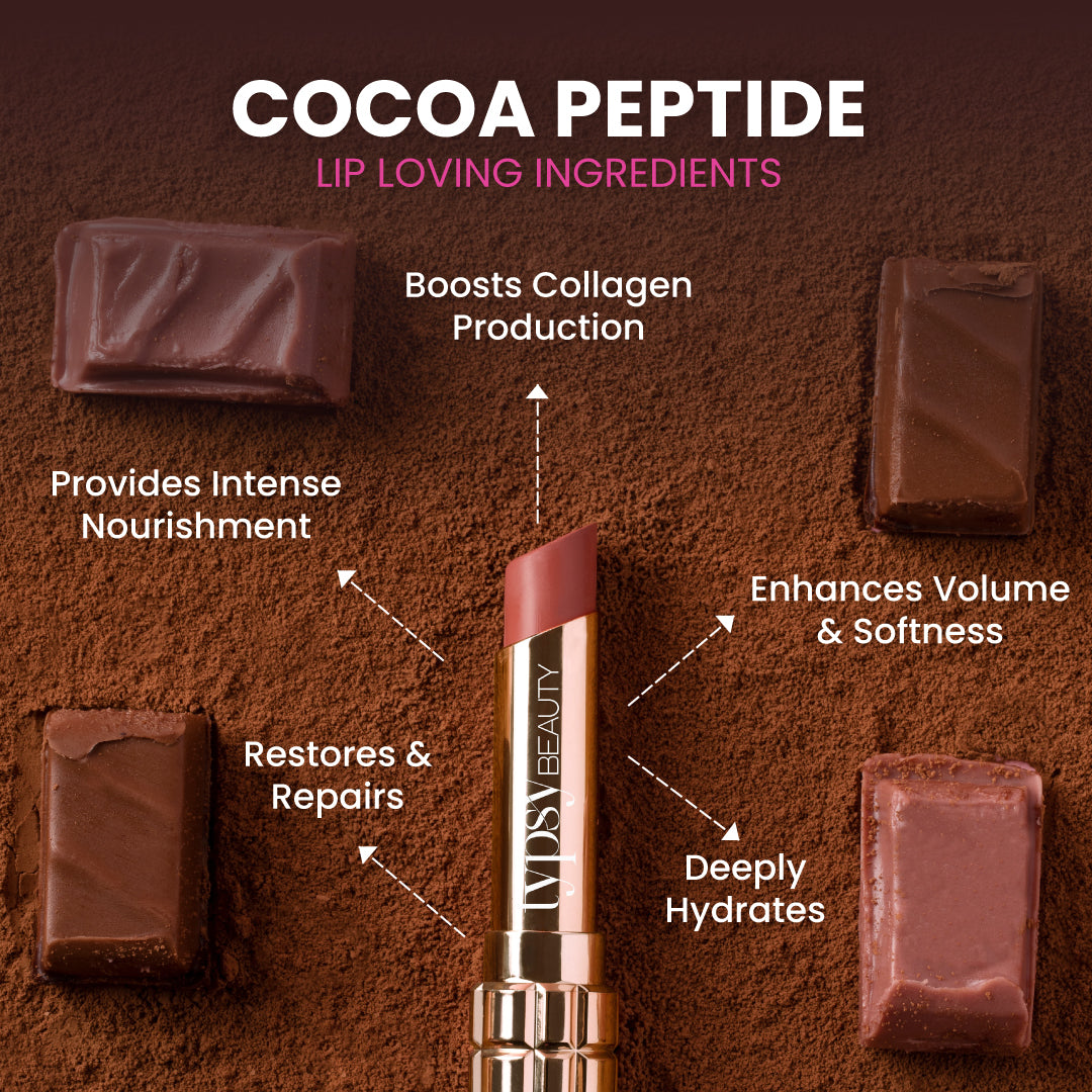 -Swipe the Cocoa Peptide Velvet Lipstick directly onto lips for full coverage in one go