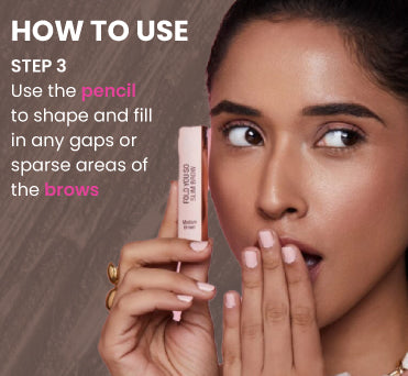 Open the cap and unfold pencil, brush up the brow hair vertically with spoolie and use the pencil to shape and fill in any gaps or sparse areas of brows.