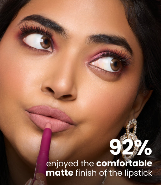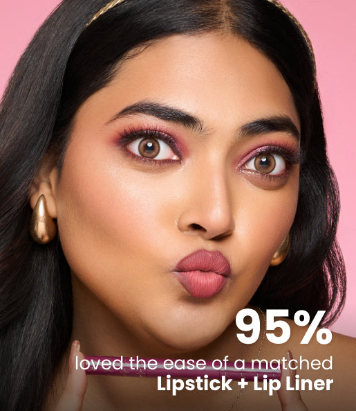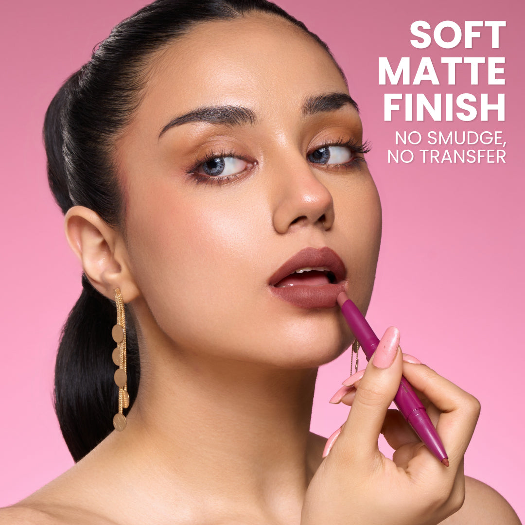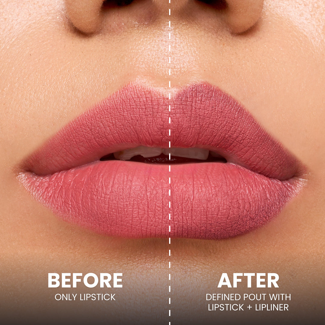 Made in China with globally renowned technology and thoughtfully crafted for Indian skin tones, this matte lipstick glides on smoothly with its unique water-drop tip, following the natural curves of your lips for flawless application. The matching lip liner, two shades deeper, shapes, contours, and defines your lips in a single step, giving you that sculpted, professional look without the guesswork.
